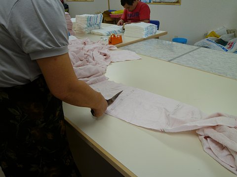 タオルの生地をハサミで切る作業もあります。切ったタオルにネームタグを貼りつけて、タオル会社に返却します。